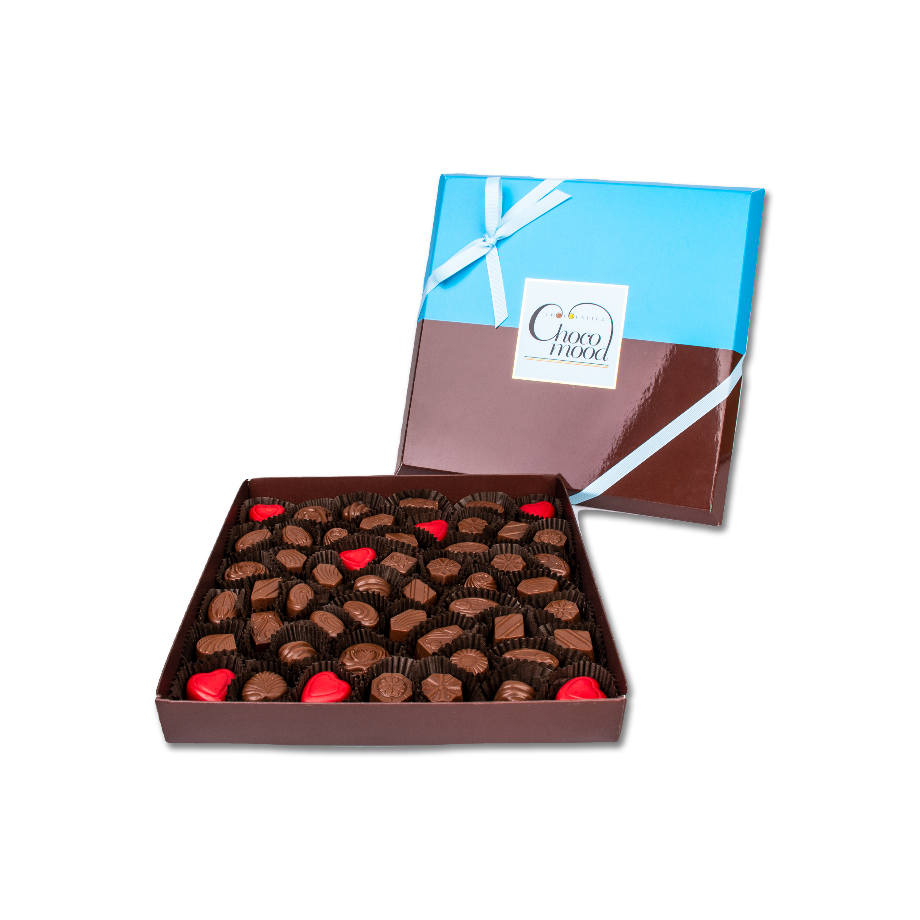 A special open chocolate box contains approximately 50 pieces. With fillings of chocolate cream and nuts with a distinctive taste